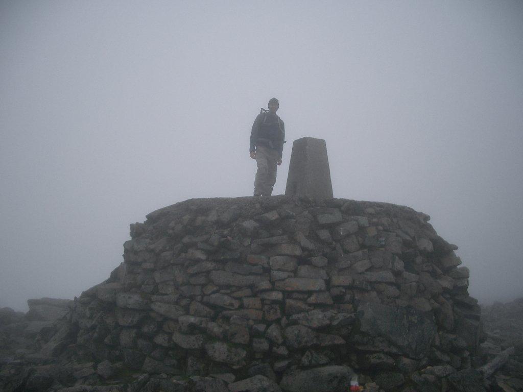 20:15 Somehow the upwards slog ended and we made it to the summit plateau and the summit itself. It’s been a long, tortuous climb up through the clouds and I’m going to have to take it on trust that this is the summit, as I can see very little outside a radius of 20m or so. Of course, glasses covered in vapour doesn’t help. We stay at the summit for around 15 minutes for photos and a snack, and to savour being at the top of the UK.