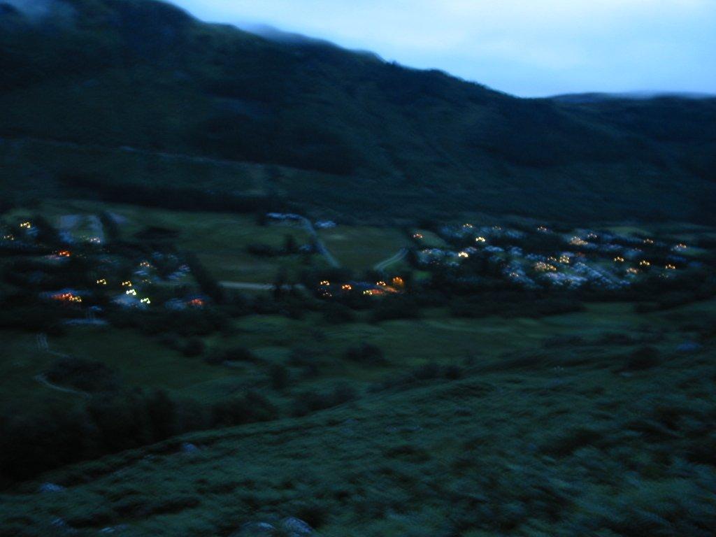 22:05 It’s taking ages to descend. Rik is having trouble with his knees and keeps needing to stop and rest. It’s now getting dark and we can see the lights in Glen Nevis below. We’re slightly anxious about what time and how dark it will be when we get back to the van.