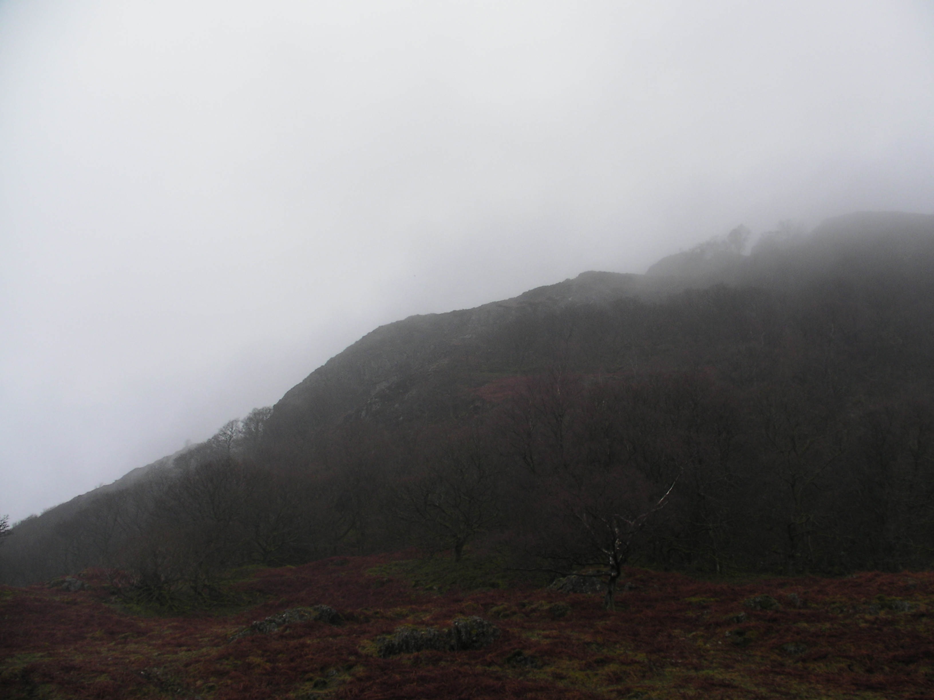 I emerged above the treeline and my Blackberry went mad as I got my first mobile phone signal for over a day. Â But I was in cloud, it was damp and breezy and so I tried to ignore the outside world as I struck left through the murk for the summit. Â I found Ivy Crag after a bit of hunting through the gloom, and then crossed a small depression to the main summit. Â Not a day for taking in the view from the summit, mainly because there wasn’t one, I headed down with the intention of picking up the main path that crosses the fell and a return back the way I came.