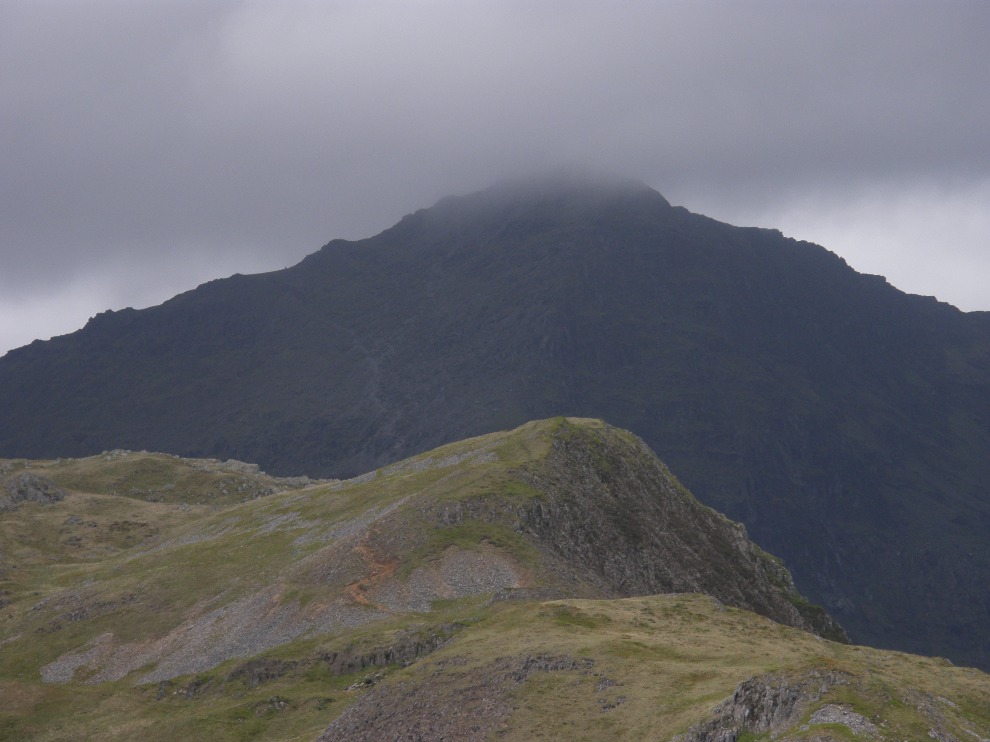 My fourth visit was last year, on my week in Snowdonia, and on this occasion I climbed up via Gallt y Wenallt and Y Lliwedd. The wind and hail pelted down as I cowered in my storm shelter for lunch on Lliwedd Bach, becoming no less vigorous as I inched my way over Y Lliwedd’s twin summits. Cloud blew continuously across the summit of Yr Wyddfa, breaking only briefly as if to taunt me. I wasn’t making good time and on reaching Bwlch Ciliau I turned left and headed down the Watkin Path. I found this route down an utter joy, especially after the more character-building walking earlier in the day. So now 4 times on the mountain, and 1 successful summit.