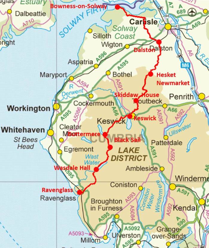 I’ve yet to walk this full route, but I’ve walked several parts of it – from Eskdale Green to Wasdale, the whole chunk from Black Sail to Hesket Newmarket, and of course the bit along the River Caldew that coincides with the official Cumbria Way. I mean to walk the whole thing in the near future, as the exercise of putting this route together at home has really fired up the desire to walk it in one go. I feel this needs to be done if I am to recommend this as a viable alternative to the real Cumbria Way, as it is only fair to give people an idea of how long each part takes and what is the sensible breakdown into daily sections. People are more likely to walk a route if they can see others’ experiences of doing the walk.