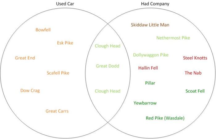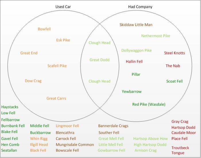Hitting both the no car and no companions criteria means redoing a total of 19 fells – 6 involving a car, 10 non-solo and 3 that fit under both headings.