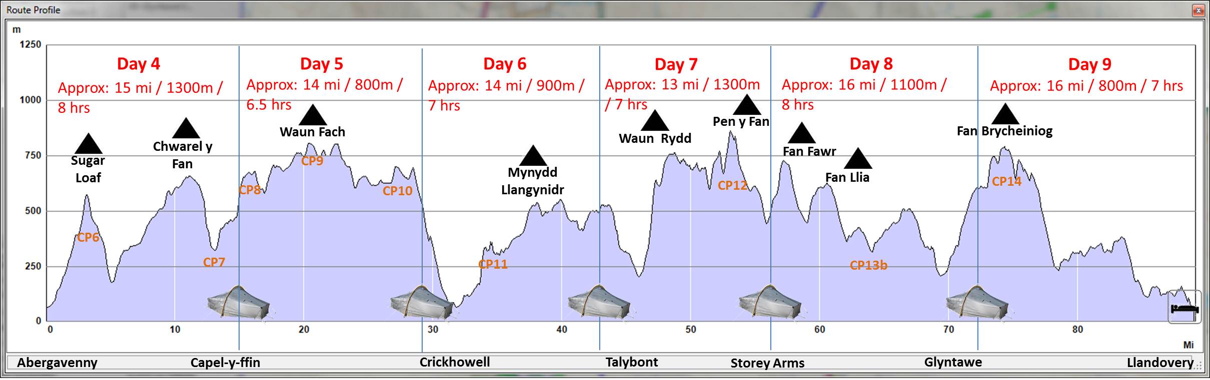 2. Please do, more than happy to have a bit of local expertise. I’ve worked some out based on what looks like flattish ground with shelter if needed, but I’d much rather have some spots in mind that I know will be decent. You can probably work out roughly where mine are from my description and route profile ;-)
