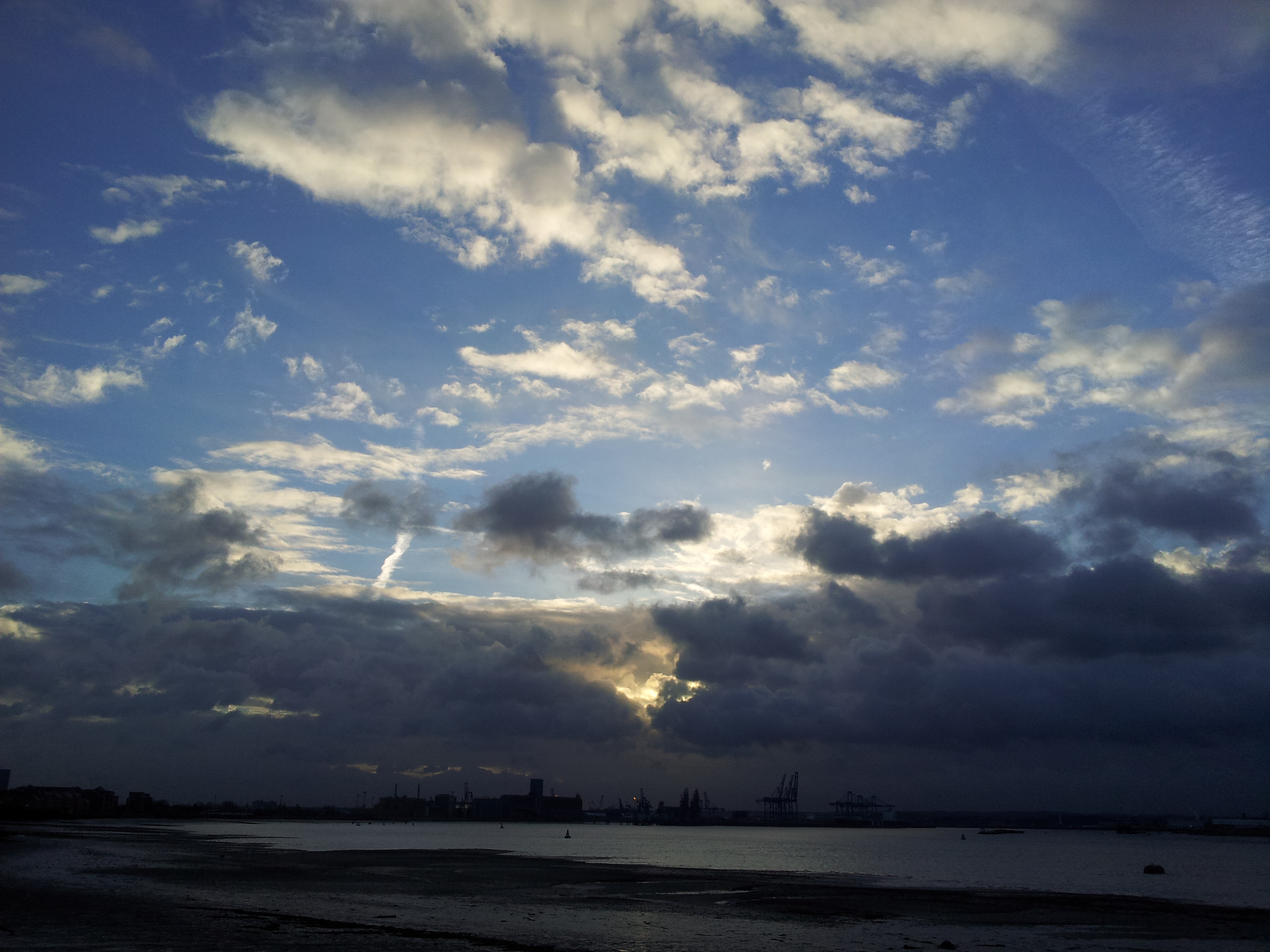 A battle between blue and grey was being fought in the sky, and would continue for the rest of the walk. Tinges of orange from the just-risen sun sneaked their way through the clouds. I crossed the railway and arrived at the waterside. Downriver, the sky was doing its best to make Tilbury Power Station look attractive, in a vain attempt to entice me that way. But that’s for the next walk. I turned my back on Tilbury, put the river on my left and slid my way along the muddy path between the sea wall and the back of the first industrial estate of the day.