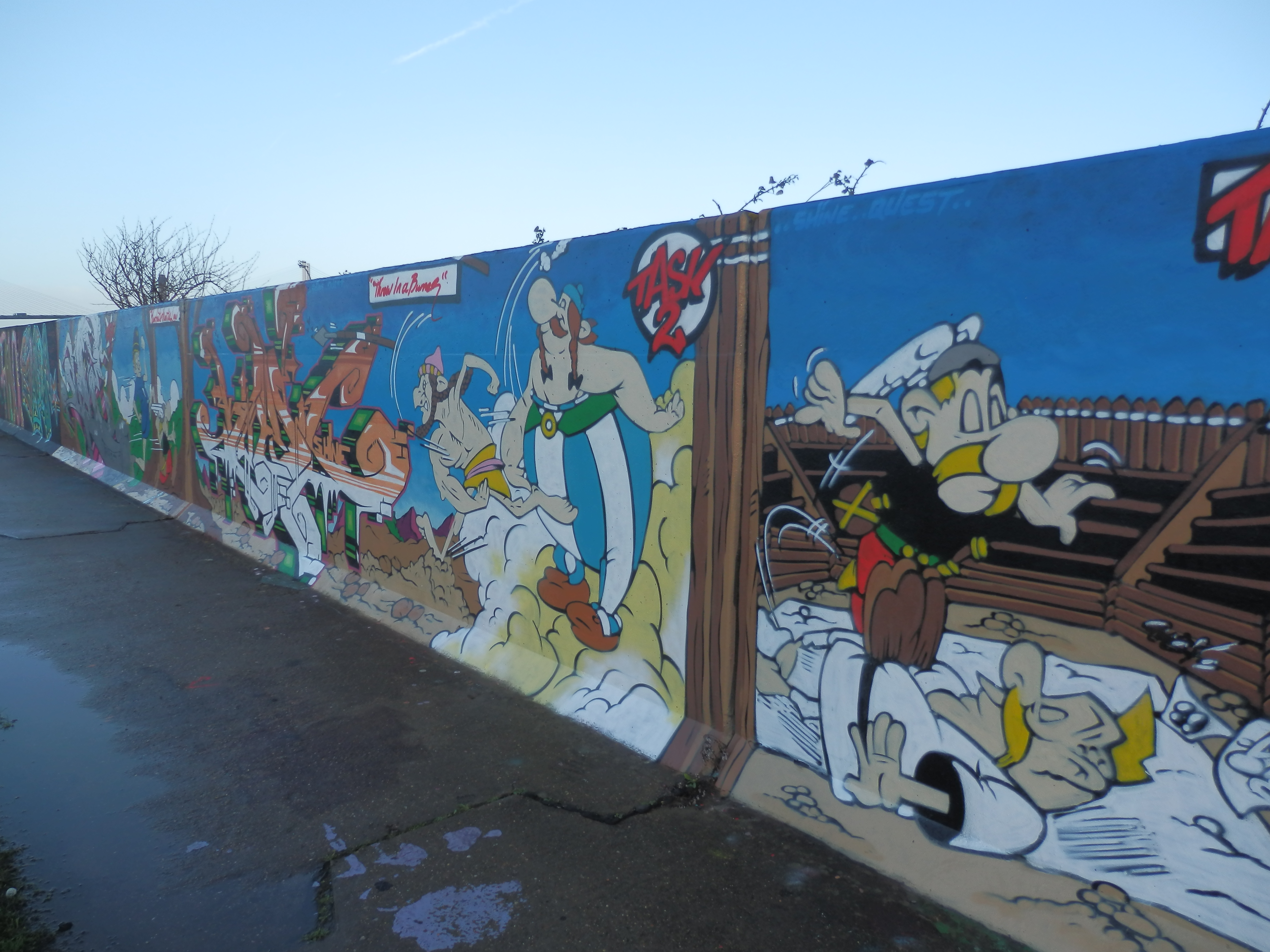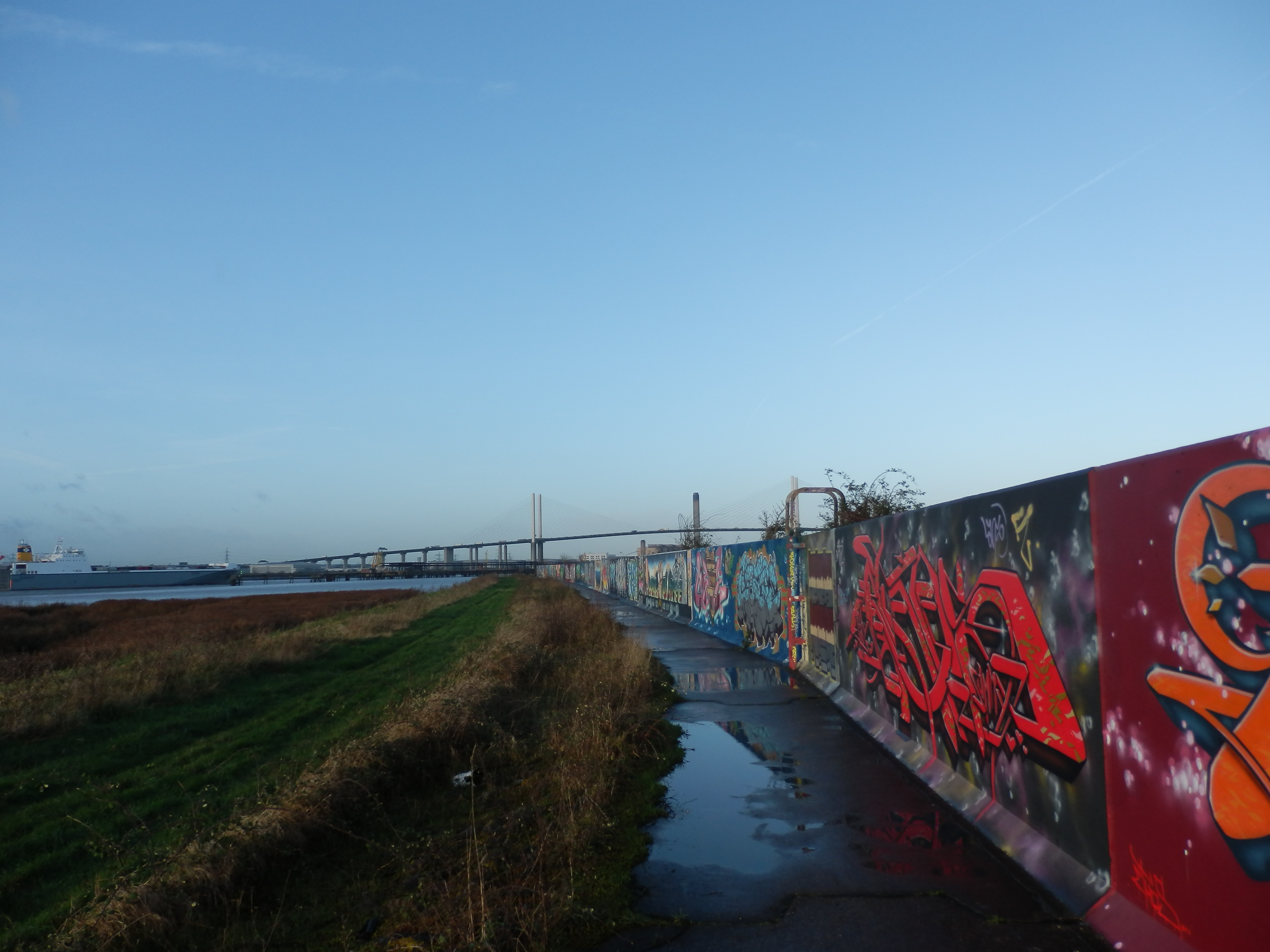 Today’s route didn’t pass the church itself, so I carried along the narrow strip of path by the sea wall, and soon came to the major cultural shock of the day. A wall of graffiti stretching for over a mile nearly all the way to the bridge.
