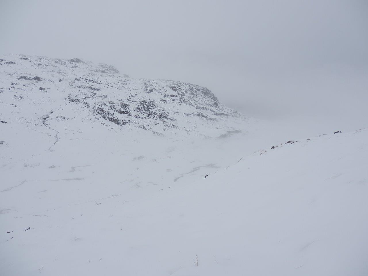 On day 3, after yet more overnight snow, I popped up high to have a look and see whether it was on to carry on with my route over the Crinkles. I ascended with no expectations other than that I knew it would be hard going and that I would likely have to camp well short of my intended spot on Lingmell. On arrival on Great Knott, visibility was poor to, at times, non-existent and so I made the correct decision to descend and to write-off that section of the route. I knew from the fell conditions reports before leaving home that the area around and approaches to Scafell Pike were particularly challenging in these conditions. Whilst I felt safe and confident in what I was doing, and had no concerns about keeping warm or in my ability to find shelter, I did recognise that my winter experience was not yet up to a prolonged spell on really steep ground with poor visibility. So I descended to focus on the southern half of my route which was predominantly  below 700m altitude and with less cloud cover.