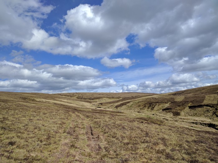As I gain height, the view opens up, ahead and all around me a sea of yellows, browns and some greens. A cloud-broken blue sky overhead. Nothing man-made spoils the view, although the course of man across the moor is clear to see.