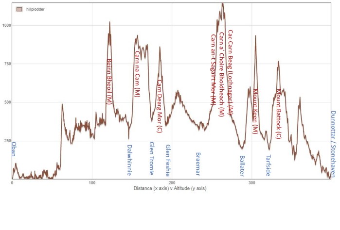 Total distance is about 326km with 9,700m of ascent. It includes 6 (possibly 7) Munros and a couple of Corbetts. That’s about right. This compares with last year’s actual distance of 324km, 6,600m of ascent, 2 Munros and a Corbett. So a little bit harder, although we are taking an extra day to do it too.