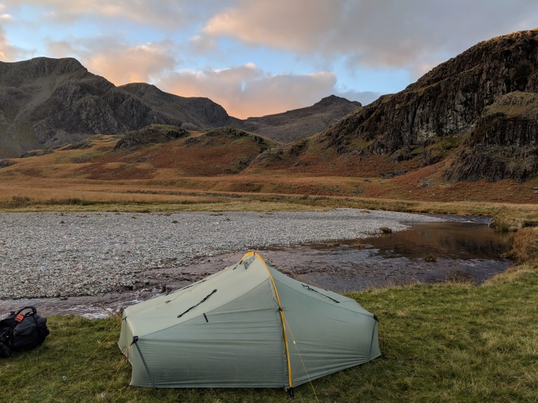 A new shelter and a more spontaneous trip. I trekked over Glaramara with a camp at High House Tarn and the next day descended down the infant Esk in wet and windy conditions. Unpleasant enough that I stopped early afternoon and put the shelter up. I endured a windy night by the side of the Esk, the whole time fearing I’d be flooded or blown away. I wasn’t