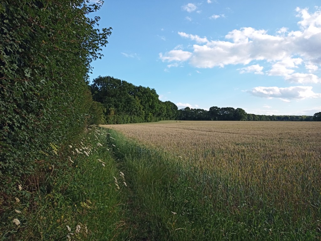 I’ve not walked this path before, so it is good to strike out across the wheat field. A left turn and the field is replaced with a rougher pasture before the path leads to cross another road. Here there are people, none seen, but the noises of people going about their business on a Saturday afternoon in a small village. The scrunch of a car on a gravel drive, a horse in the field I’ve just left and in the distance a muffled bark of a dog.