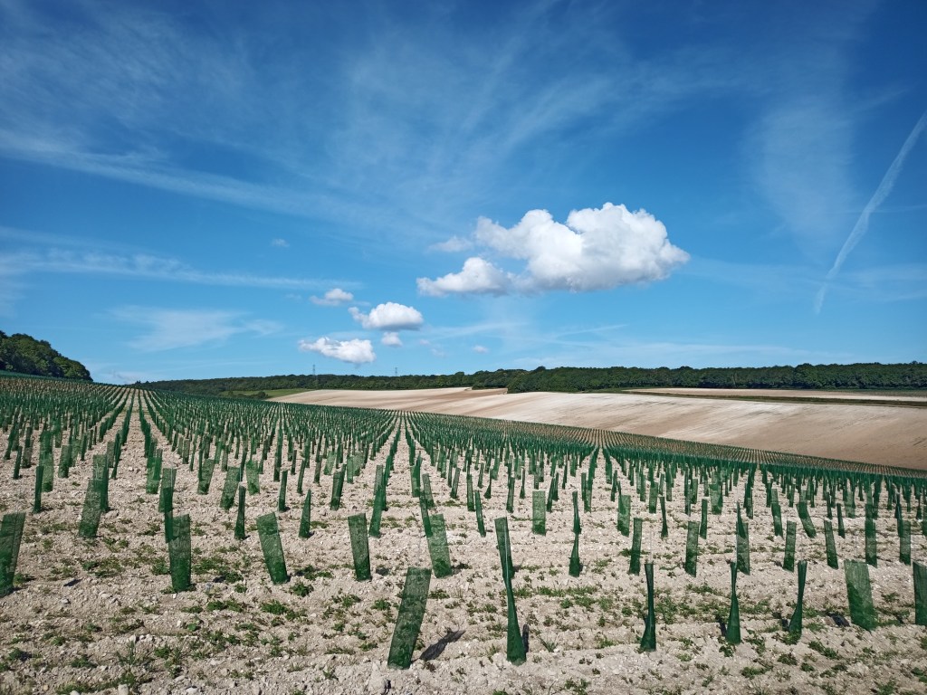 I find out when I’m the other side of Upper and Lower Bush and struggling up the hill to Cobham Woods, that all the green tubes are protecting vines – apparently the farm is trying its hand at viticulture.