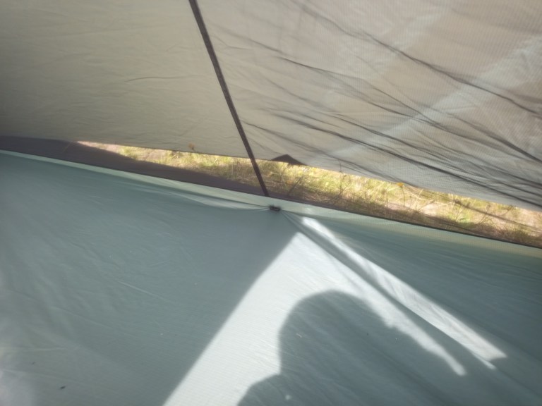 I woke up after my first night in the tent and found my feet and quilt touching the mesh. With a Thermarest Xtherm mat under me, either my head or my feet touches the mesh, which is not what I’d choose. Luckily the separation between inner and fly is good, so even touching the mesh doesn’t get anything wet anyway.