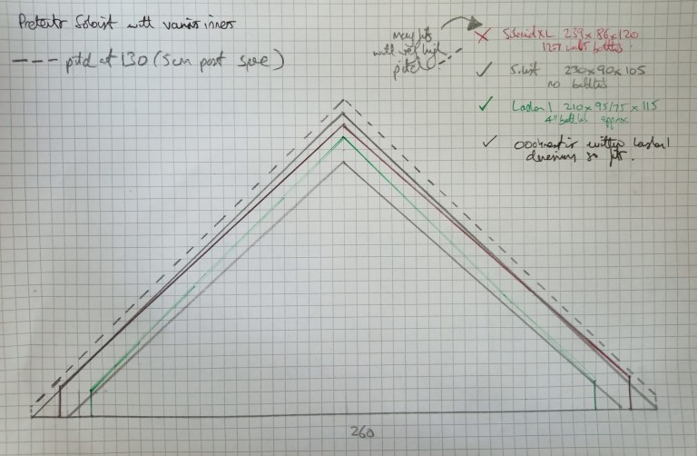 I sketched the effect of a 130cm pitch, and the solomid XL inner now fitted, albeit with not a lot of clearance at the top of the bathtub.
