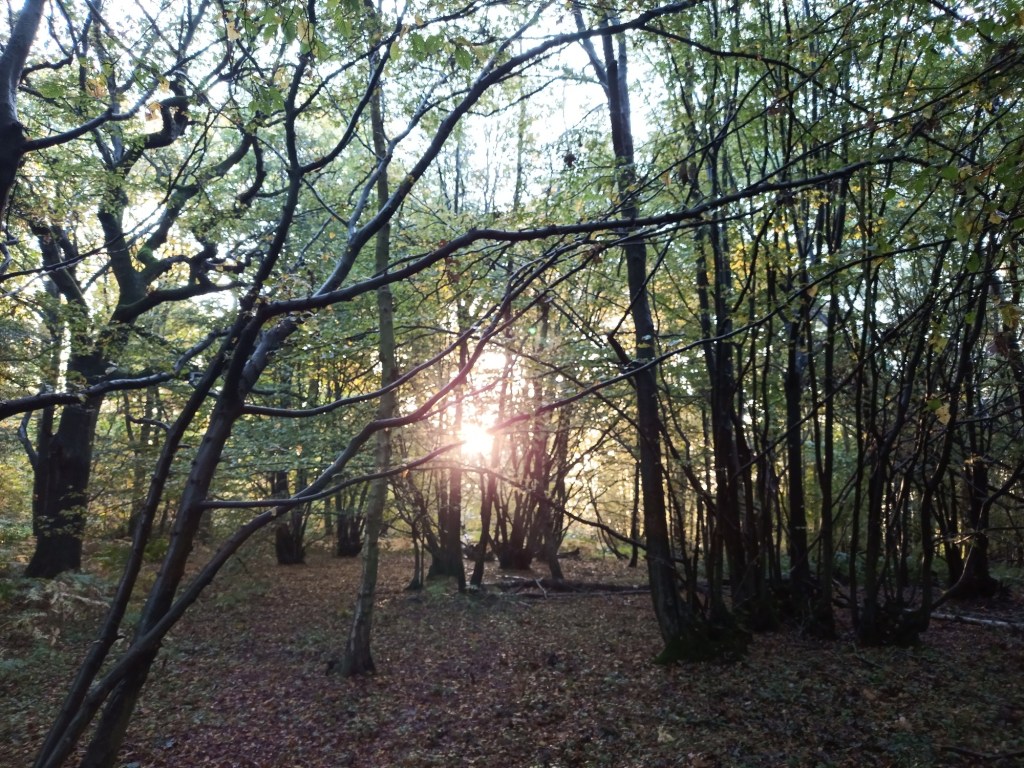 I packed up soon after sunrise, and meandered through the forest, having the place to myself, and watching the sunlight playing on the branches. I reached the point where I needed to turn and head down to the car and did so, a sunlit holloway being my path.