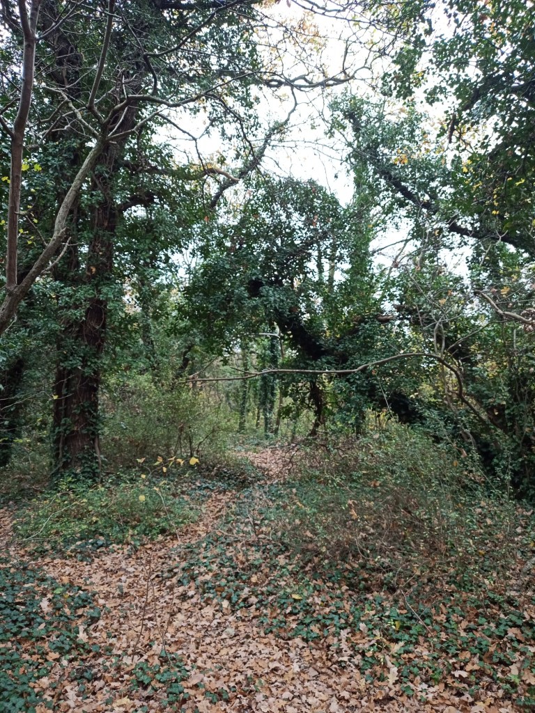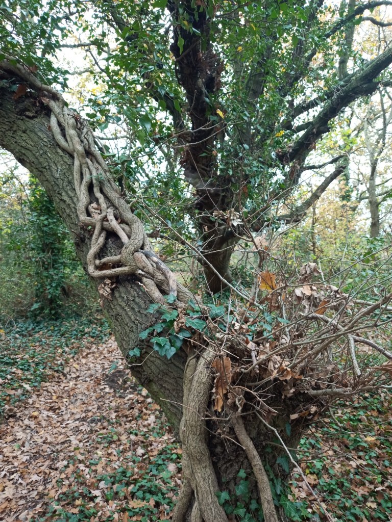 The thinning opens up new routes through the middle of The Wood, narrow channels of leaves threading their way through a blanket of ivy. A blanket that twists its way up the trunks of the tree too.
