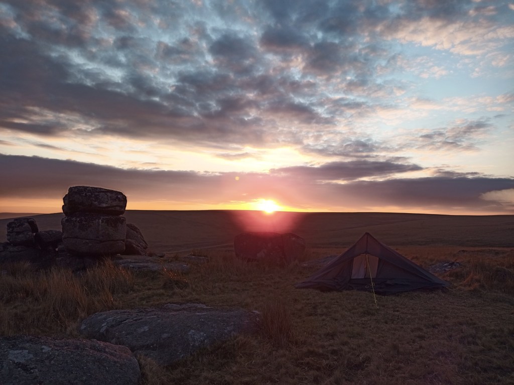 The second night at Fox Tor was, if anything, even more exposed, due to a paucity of sheltered spots to pitch. It was a choice of shelter or a workable pitch. I found myself being upwind of the others, taking the full force of the wind square on the back of the tent. This helped a lot with warmth and draughts, and the shelter actually held pretty solid the whole time. The addition of those corner seam reinforcements has massively strengthened the shelter.