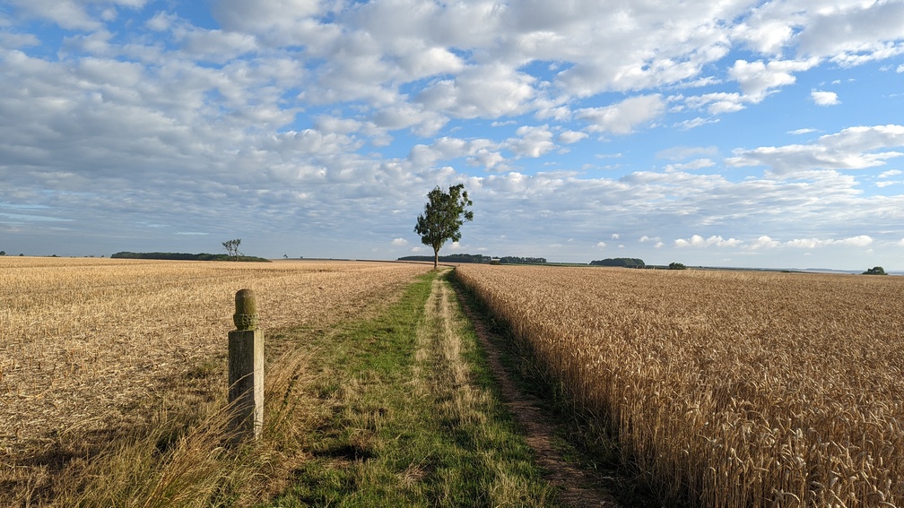 I hit the road to Wharram-le-Street, then a succession of wheat fields and small wooded bits. Flying along quite nicely, I was very much in the mode of see how much I could do today. with about 50km to the end, it was pretty clear that I’d finish tomorrow, and given that was the case it would be better to go further today to make for a shorter finish and earlier arrival at home the next day. But it would also give me the option of extending the walk to Scarborough if I wanted.