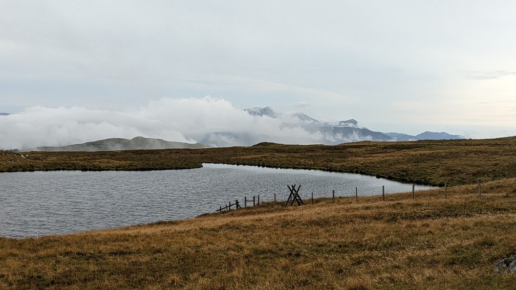 I couldn’t see much though as surrounding hills were shrouded in cloud. Also being exposed to the wind, it was a bit cold, so I decided to push on.