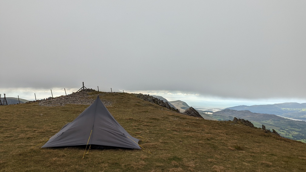 Ahead I could see Penygadair itself – too much to do today, and uncertain about how easy it would be to pitch, I resolved instead to simply find a spot as soon as I could and stop there. This turned out to be a short way down the slope of Mynydd Moel, just before the ladder stile. Here I could see all the way to Barmouth. It would do, even though it was a bit breezier than I’d like and a bit nippy as a result.