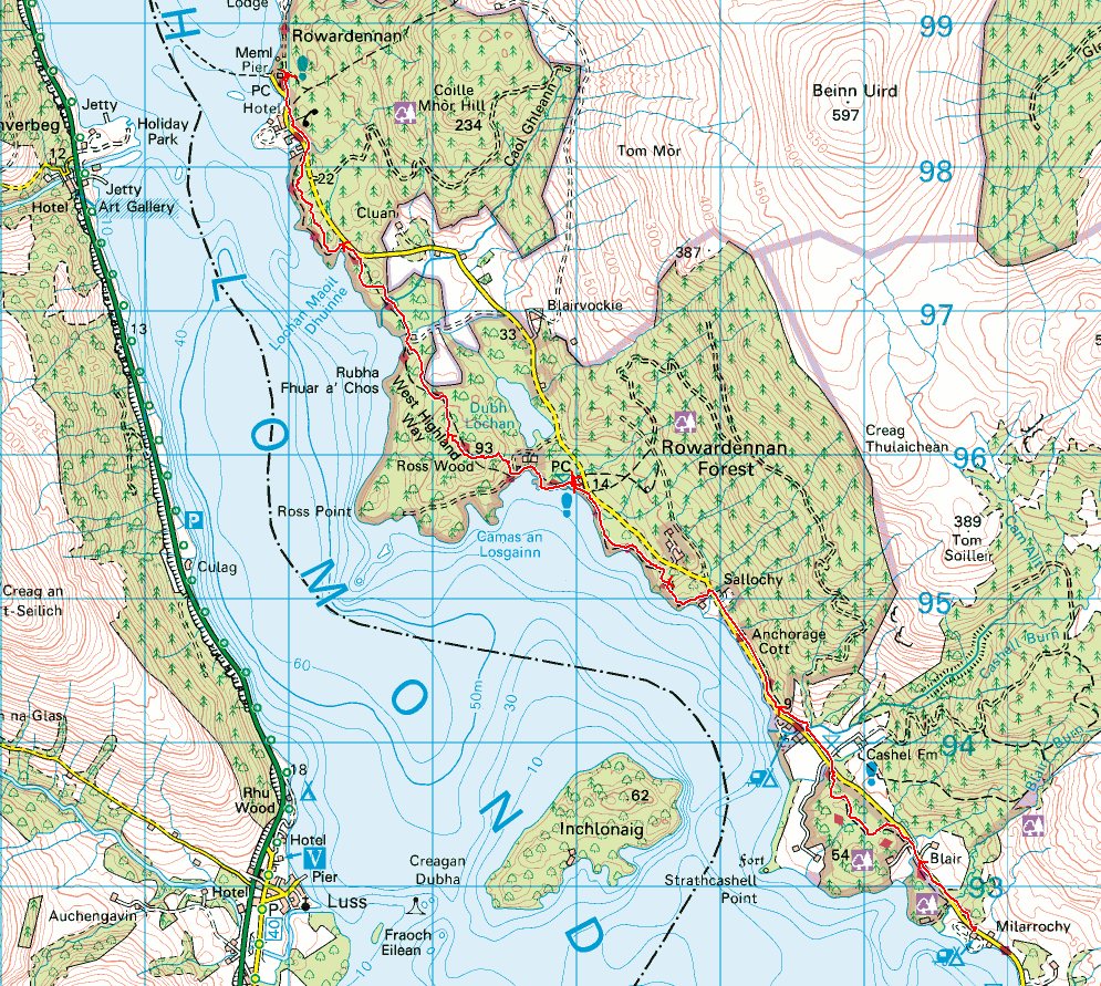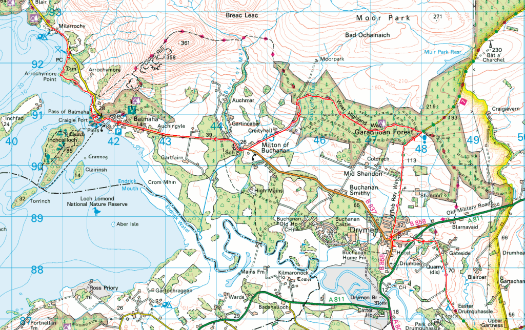 We put it off as long as we could, under the pretence of “planning”, but eventually had to get going again. Having decided to only go as far as Milarrochy today, I nipped into the adjacent shop to buy dinner – it was a night for real food.