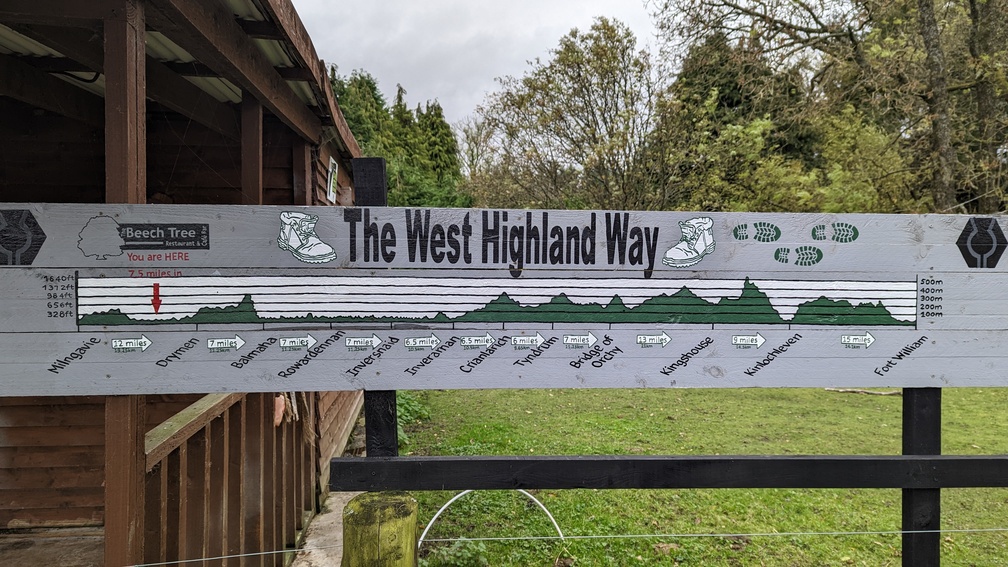 Milngavie really must be quite proud of the fact that the West Highland Way starts there, as they’ve taken every opportunity to draw your attention to the fact. Leaving the railway, there’s various “to the West Highland Way” signs and the murals in the underpass before you get to the actual start point, itself with a monolith, benches, paving, signs, information boards. If you were in any doubt, it would have been cleared up by now.