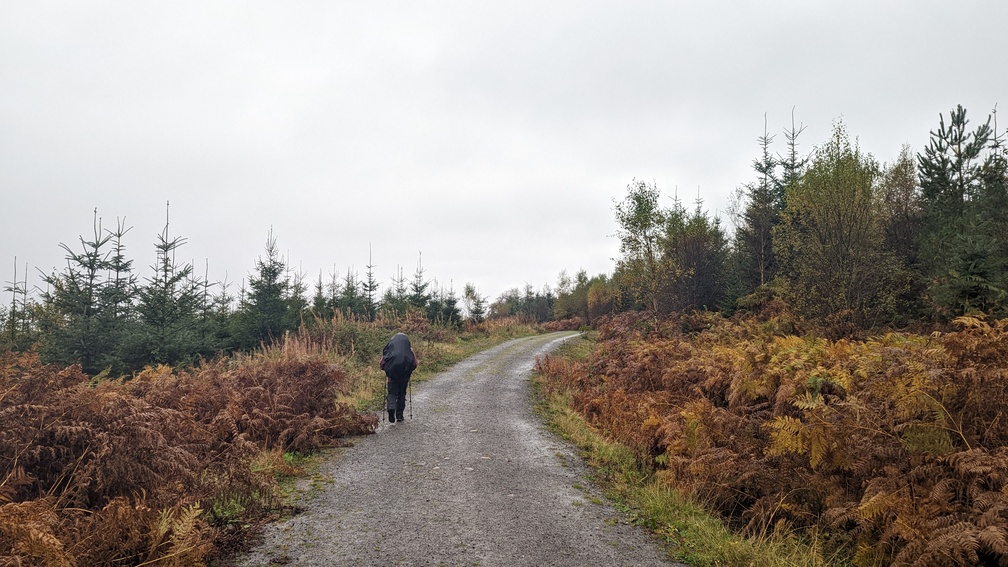 On the walk in to Drymen we’d debated whether we would simply return back out the same side of Drymen afterwards and then loop around on the WHW to the north of the village, or just cut the corner off, following the Rob Roy Way briefly. The pouring rain and general misery of the scene made this an easy choice – the shortcut along a nice tarmac road.