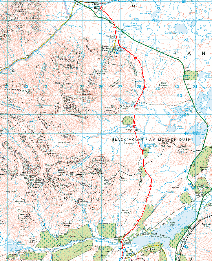 Not in any hurry now as we’d done most of what we planned to do today, we set off unhurriedly for the climb through the forest and over Mam Carraigh. At the top a cairn and then down to a lone tree where the Inveroran Hotel came into sight.