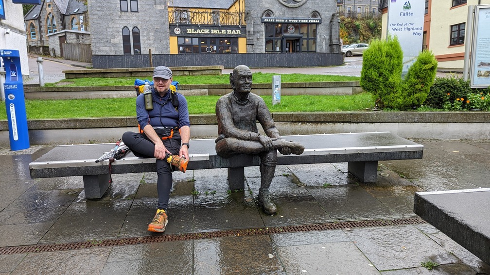 As I rolled into Fort William at Nevis Bridge, Paul was waiting on the other side of the road as he’d been following my inReach track. We walked down the high street together to the end. The mandatory “copying the sculpture” photo was of course taken.