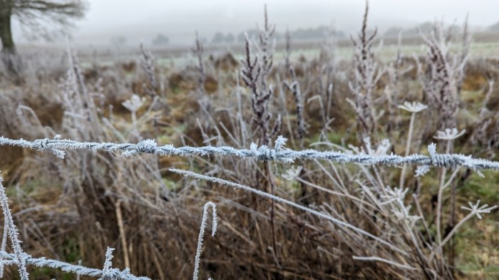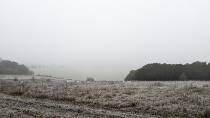 As I descended down a frosted-over muddy path, I had to take considerable care – it was pretty slippery in several places. Not that there was much to see on either side anyway – a blanket of mist remained, and stayed for most of the day.