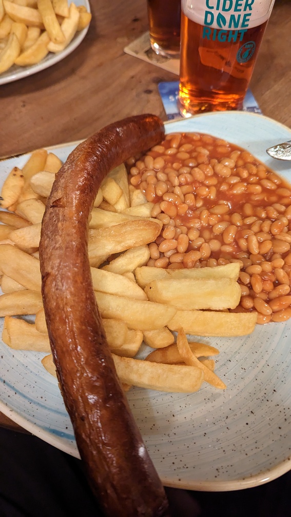 Chris duly arrived and they all went for pies, while I went for the “dirty sausage”.