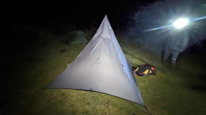 It was a good test of the new headtorch too. The patch of ground we were aiming for wasn’t quite as flat as I’d have liked, and I had to position the tent carefully between the cairns of horseshit.