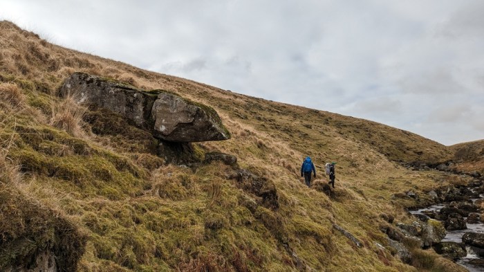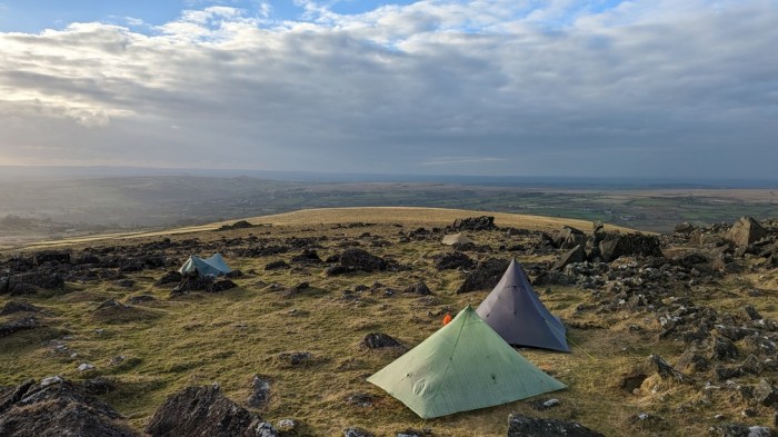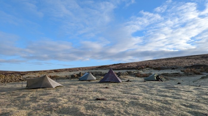 We clambered over White Tor to the western, and today sheltered, side and looked around for pitches. There was a fair amount of shrugging when it was put to the group to decide whether we wanted to stop here or try somewhere else. Personally, it felt a bit more exposed than I’d have liked for the quality of ground we were getting, but we decided to stay by default, through no one voicing a strong enough view to go elsewhere!
