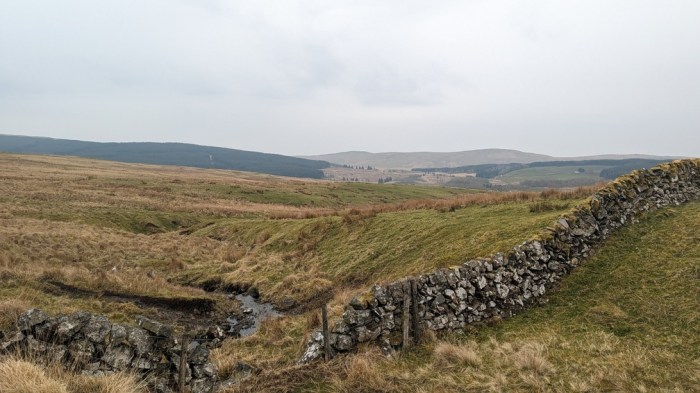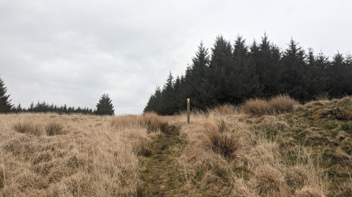 Now it was a case of rollercoastering over some lesser bumps, all following a fence line. Opting not to divert to Colt Hill, I struck off at the edge of the forest heading for Allan’s Cairn, meeting a couple of ladies coming the other way working to “fill in” a gap in their SUW walk.