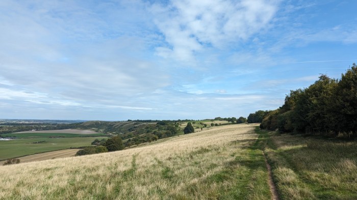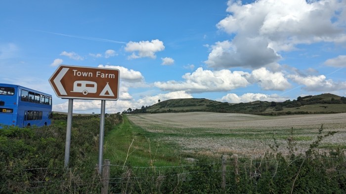 A quiet night, and a sensible start at 8am. The washing up / utility facilities at Town Farm campsite were especially good and also had a large noticeboard with loads of local information. One notice of local walks inspired a change of way up to the beacon. I had intended to go straight up, the reverse of the precipitous slide and chalky scuffing of clothes and limbs I’d had at the end of the Ridgeway itself.