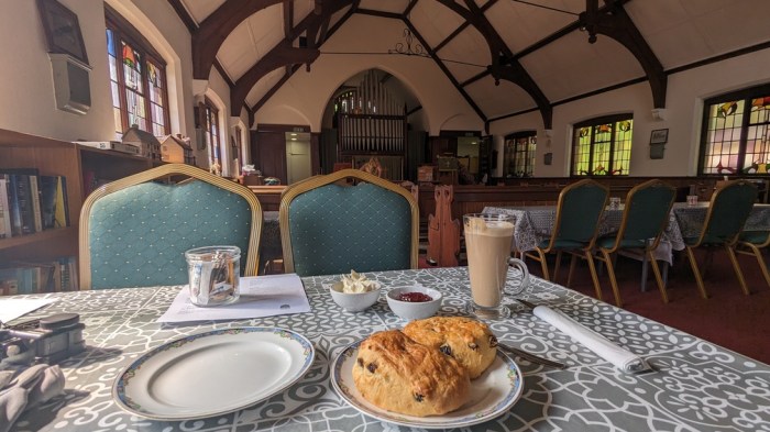 Through fields and past village ponds to the very top-rightmost corner of Luton’s sprawl, a golf course then the climb onto Galley Hill. A succession of byways brought me to Pirton where I made a beeline for the Chapel Tea Room, open Fridays and Saturdays in the Methodist church. A much nicer setting than the one I’d started the day in. I ordered a couple of scones with the full works, and was brought two boulders – certainly contenders for the largest scones I’ve ever had. They were really light and fluffy inside though and were a joy to consume.