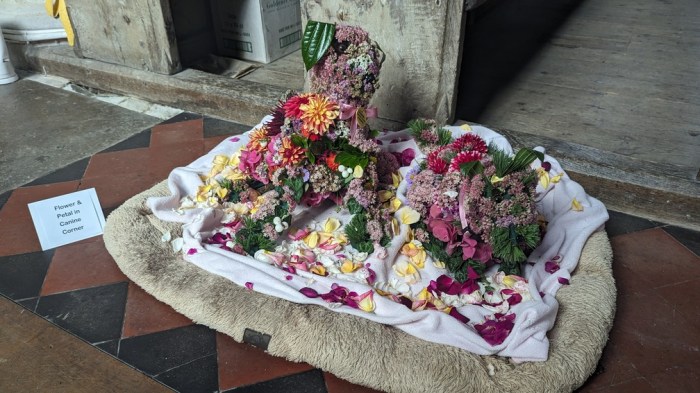 I walked into Baldock, picked up a coffee and then headed down through fields to cross the A505. A succession of back lanes and byways brought me to Sandon, where they were setting up the village fete on the green. I went for a bench in the churchyard. The vicar walked past and was pretty insistent that I stick my head inside the church for coffee and cake. Not wanting to offend a woman of the cloth I did as I was bid. One of the parishioners gave a guided tour of the animal-themed flower arrangements inside. In the background Europe’s Final Countdown and Van Halen’s Jump emanated from the organ.