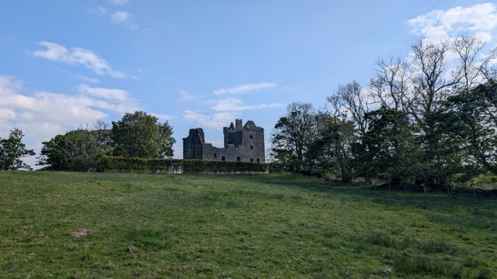 I was away for 08:35, and the path took me back past most of the stones I’d explored the previous afternoon. Then on past some quarries to the ruins of Carnasserie Castle. After I worked out how to get down to the road, I had a short dalliance with the A816, before the B840 branched off towards Ford. I had a brief rest there, but even this early in the day I was focussing on the shop/cafe at Dalavich and wanted to make sure I got there while it was open.