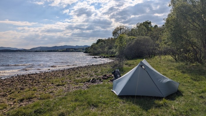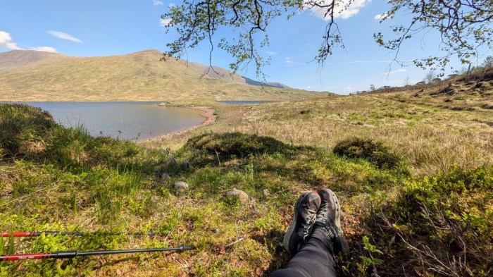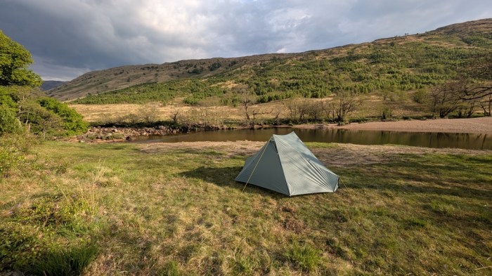 I soon found a spot on the shore of the loch and decided to go for it. It took a while to find a decent patch to put the tent on but eventually succeeded. The water from the nearby stream looked a bit iffy, so I decided to stick with the supplies carried from Dalavich – a degree of rationing would be needed.