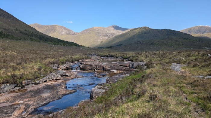 An easy track up the glen, and I concluded I’d picked the best camp spot scenically if not zoologically. I had a lot of distance to do, but extra time needed to be allowed to enjoy the scenery, now that I had some. A little way past the lodge, where there was lots of exposed rock on the river bed, I stopped for a brew up.