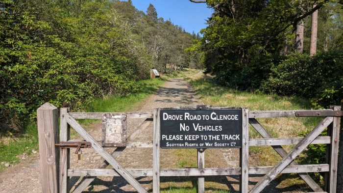 The track crossed the river and I encountered a confusing sign that appeared to both encourage (from its direction) and discourage (from the implied tone) walking through Clashgour. I continued along a faint and winding path along the banks of the Abhainn Shira.