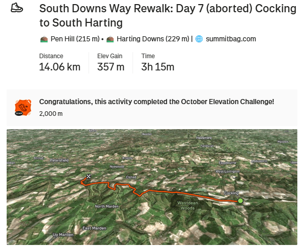 This was supposed to be a 3 day trip in which I’d reach Winchester, and complete a full rewalk of the South Downs Way. But it wasn’t to be. I’d relied on the forecast and gone with my softshell as my outer layer, trusting the forecast. My softshell was perfect for the temperatures, wind and amount of rain forecast. It was no match for sustained heavy rain. Yes I should have taken a hard shell too, but this was supposed to be a quick trip in predictable conditions, so I took the chance. It didn’t pay off.