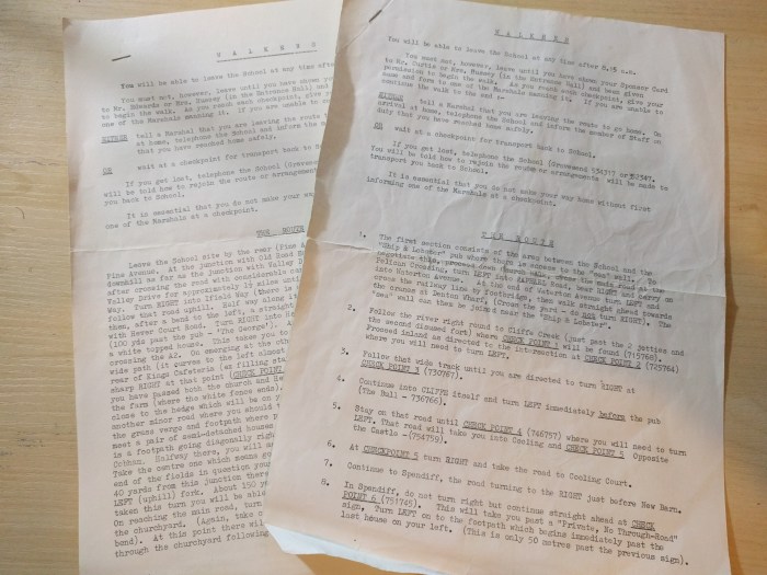 I was having a sort out the other day and came across some interesting bits of paper... Somehow I've managed to keep hold of the walk directions from two annual sponsored walks I did when I was at school. They're around 30 years old. Just for fun I thought it would be interesting to try … Continue reading Resurrecting Some Old Walks