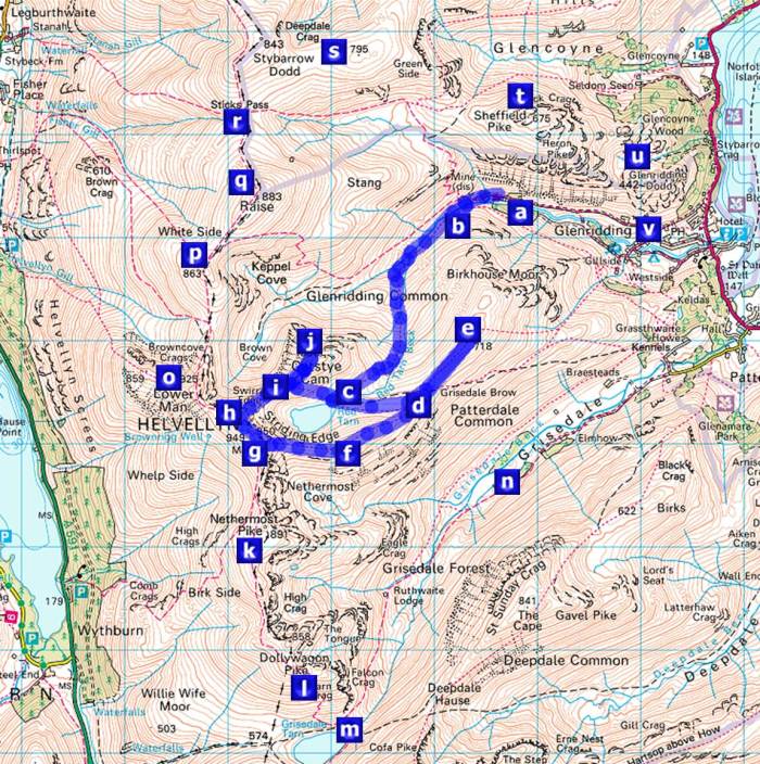 - Or you could continue the walk north from Sticks Pass onto Stybarrow Dodd and Hart Side and Green Side (s). Descend towards Sheffield Pike (t) and a steep descent to Glenridding Dodd (u) will bring you out lower down the track between the hostel and Glenridding village at Rake Cottages (v). (This is the walk I actually did as shown in the video above).