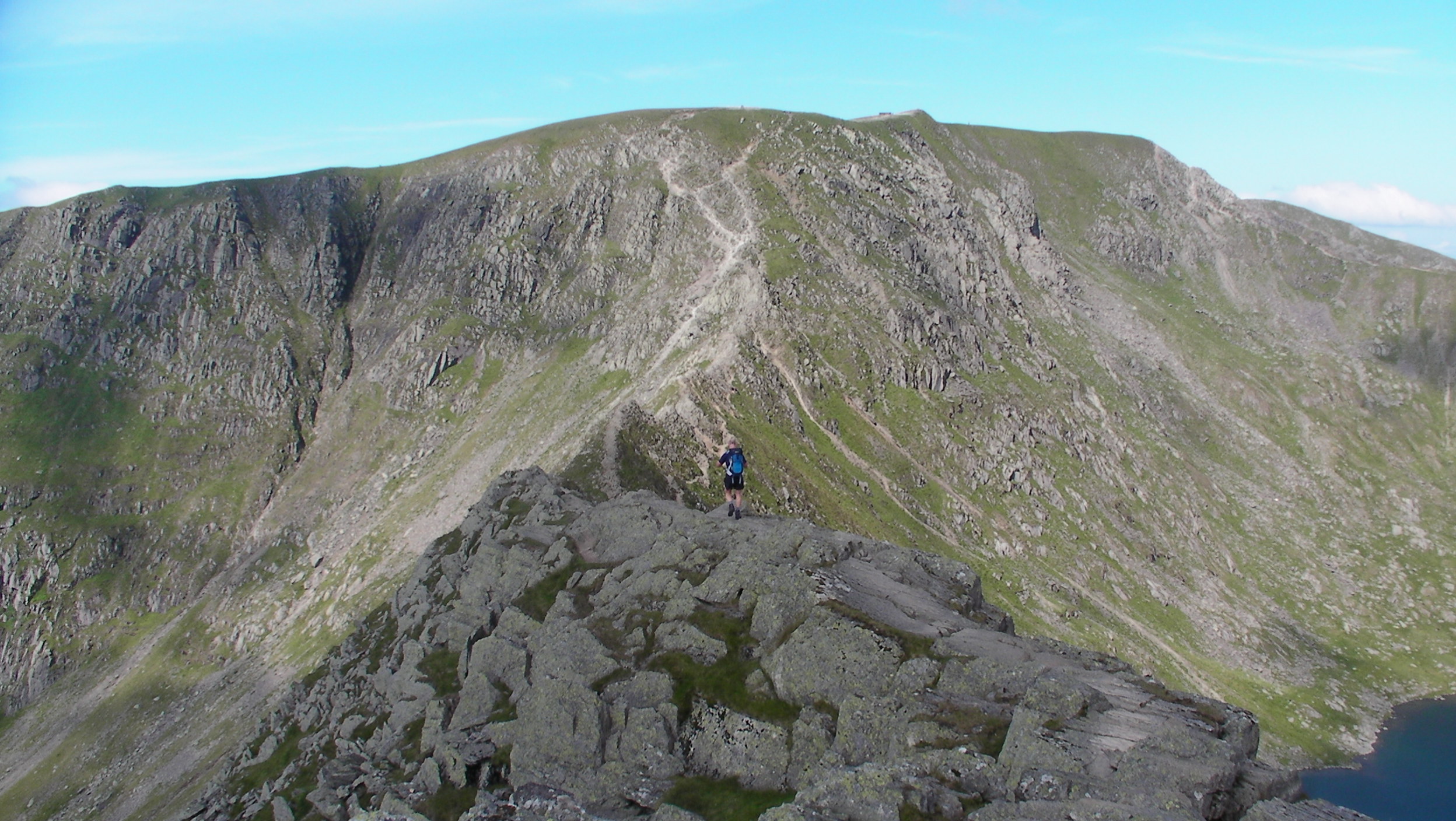 Take the path that slants back left from the tarn (roughly due east) to climb Birkhouse Moor, joining the crest in the ridge at the Hole in the Wall (d). Here you could detour briefly to the summit of Birkhouse Moor (e) by heading along the ridge away from Helvellyn.