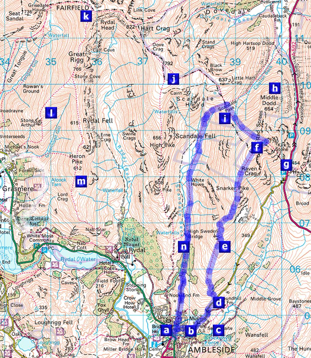 Leave Ambleside from the Market Cross (a) taking the road signposted for Kirkstone Pass. Follow the road (b) gradually gaining height alongside Wansfell to your right. A worthwhile detour on the way is Stock Ghyll Force (c) – simply follow the signs. Eventually at about 220m above sea level, cross the road (d) and take the footpath on the left which winds between the dry stone walls, gradually pulling up the long ridgeline (e)