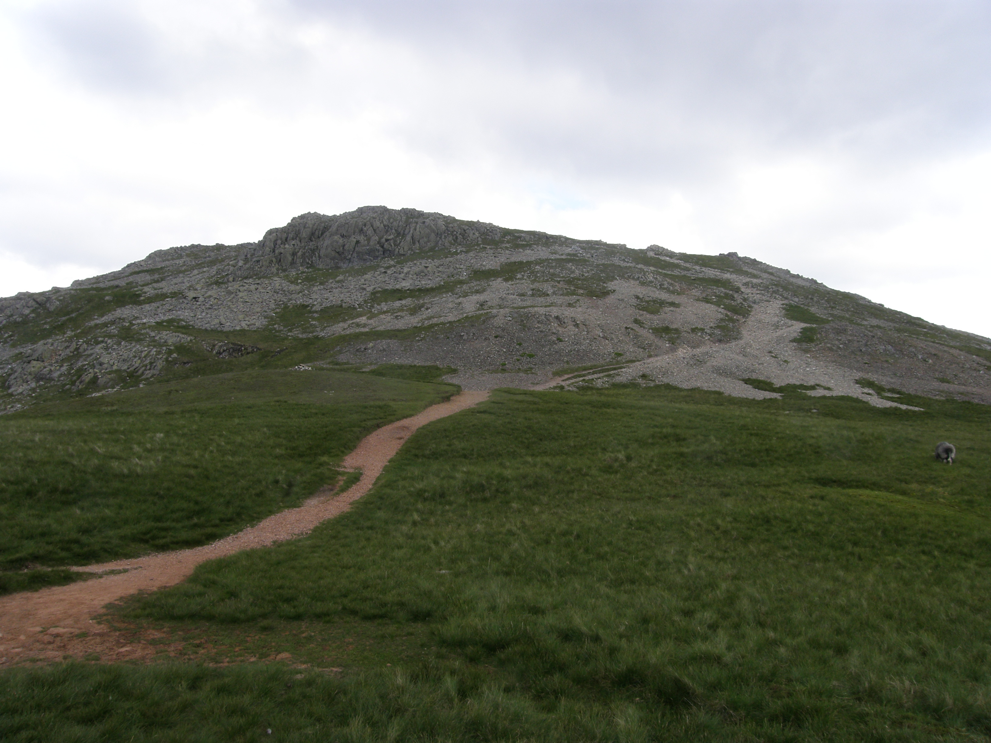 Once up the crags, simply head south over the top of the fell (e) with Great End rising up ahead of you.